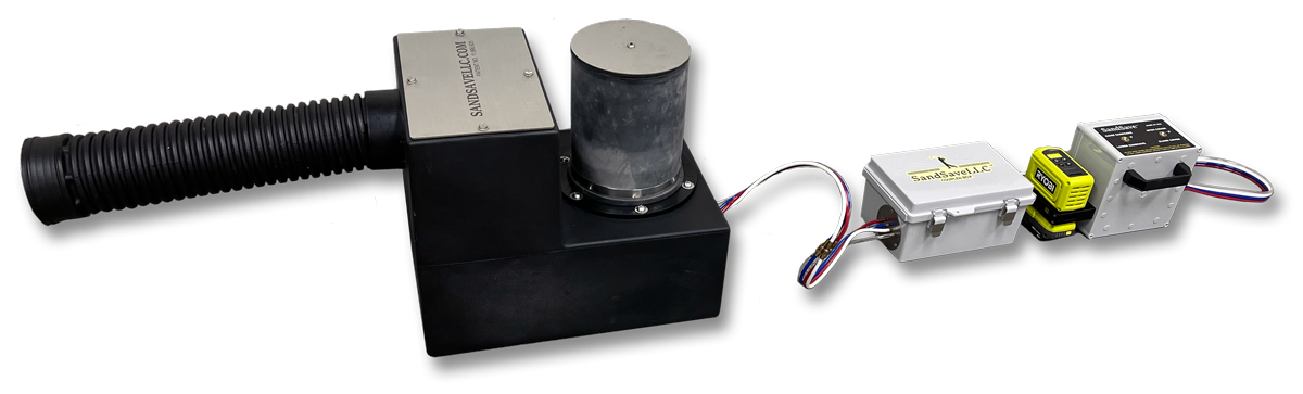 The Mobile Controller is a battery powered portable air compressor/controller. Two toggle valves allow the user to control the complete operation of the SandSave. The Mobile Controller temporarily connects to the Drain Box thru the quick connect coupling in the Coupler Box.